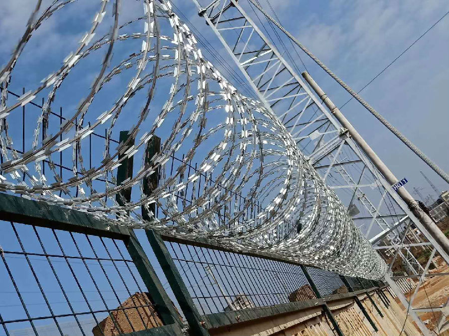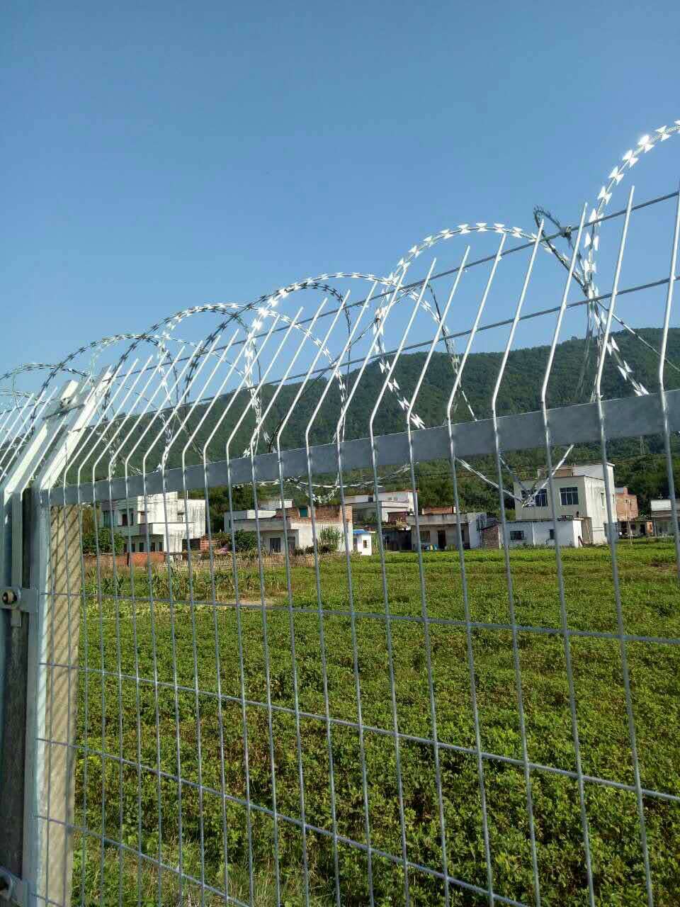 高鐵防護柵欄為冷拔鋼絲點焊熱鍍鋅再熱浸塑網片,外型尺寸為2760*1790mm,網格尺寸為75*150mm,鋼絲為φ4mm , 網片邊框采用30*50mm的方管焊接而成,防盜螺栓的螺柱、螺帽、墊圈等作熱鍍鋅處理。鐵路柵欄網片表面采用熱浸塑處理,顏色為墨綠色,整個結構表面平整光滑,色澤均勻,無漏鍍、開裂、脫皮及脫落等缺陷。網片浸塑所用的材料及PE表層環保性好,無污染。網片上方加裝蛇腹形滾刀網,有效的防止攀爬。