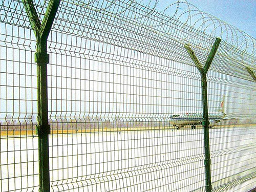 機場上使用的一類護欄網并不為人們所熟知,它又稱為“Y型安全防御護網”、機場護欄網或機場圍界隔離網,是由網片、V型支架立柱、焊接片網以及上面的刀片刺繩(又稱刀片網,刀片護欄)和安全防盜連接件組成,它的強度和安全防御性級別都很高。為了增加其防腐性能,適應戶外暴露在空氣、雨水、太陽直射下,護欄網表面采用了熱鍍加浸塑的表面處理方法:產品均為熱鍍鋅處理后采用高質量的聚酯粉末靜電噴涂,機場圍界隔離網采用國際流行的RAL顏色。
