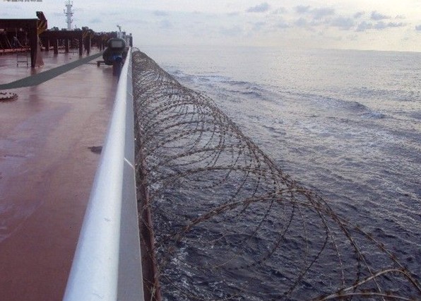 為了防止海盜襲擊商船,我公司已經推出了一種新型防盜器械,刀片刺網又名刮刀型刺絲,是一種近年發展起來的防護、隔離能力較強的新型防護網產品。它采用鋼板沖壓成型包附于鋼絲(筋絲)之上,由銳利尖角鍍鋅鋼板或不銹鋼薄板做刀片,高張力鋼絲做芯線組合而成的。船舶防海盜刀片刺網芯線材質:采用*的--熱鍍鋅高碳鋼絲、熱鍍鋅中碳鋼絲、不銹鋼板線等等。 刀板材質:采用*的--熱鍍鋅鋼板、不銹鋼板。船舶防海盜刀片刺網工 藝 它采用鋼板(刀板)沖壓成型包附于熱鍍鋅鋼絲(芯線)之上,由銳利尖角鍍鋅鋼板或 不銹鋼薄板做刀片,高張力鋼絲做芯線組合而成的。型 號 刀片刺網分為BTO與CBT兩種 BTO包括 BTO-10 BTO-18 BTO-22 BTO-28 BTO-30 CBT包括 CBT-60 CBT-65 BTO-22為國內*常用船舶防海盜刀片刺網型號(其它型號也可以訂做)。特 點 刀片刺網又名刮刀型刺絲,是一種近年發展起來的防護、隔離能力較強的新型防護網產品。鋒利的刀型刺由雙線扣裝后成蛇腹狀,既美觀又讓人不寒而栗。起到了很好的阻嚇作用。同時該產品具有美觀、防阻效果好、施工便利等優點。船舶防海盜刀片刺網其他用 途 世界各國已將安平星宇生產的刀片刺網廣泛用于軍事重地、監獄、政府機關、銀行,以及生活小區圍墻、私人住宅、別墅的圍墻、門窗、高速公路、鐵路護欄以及邊境線等用來防護保安。 中國監獄基本上用的都是刀片刺網。
