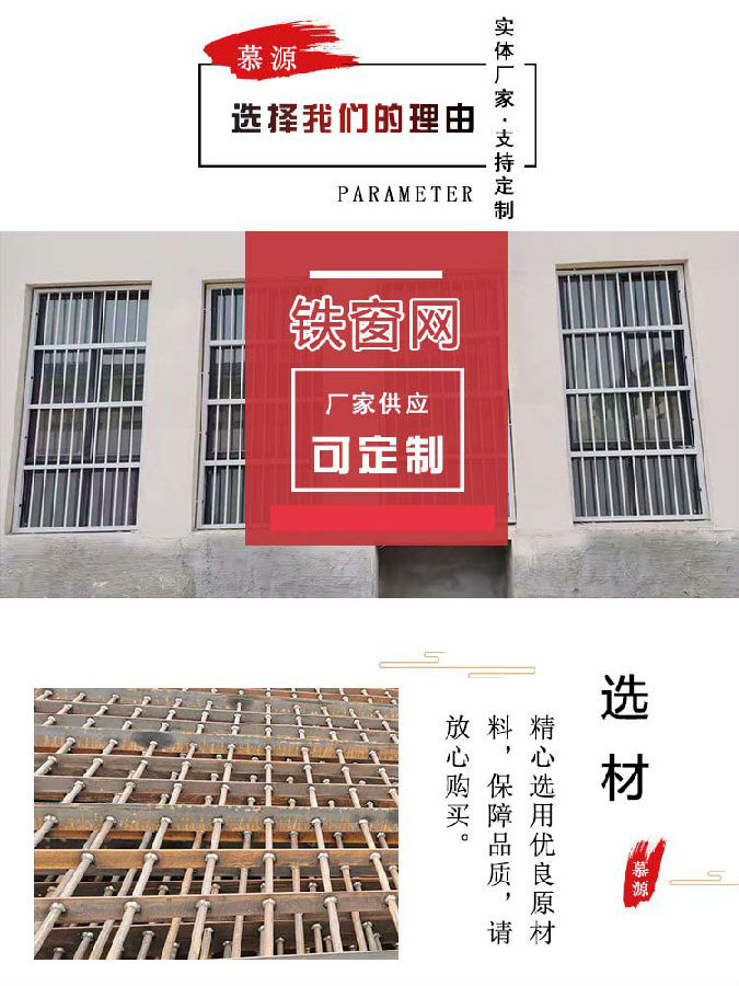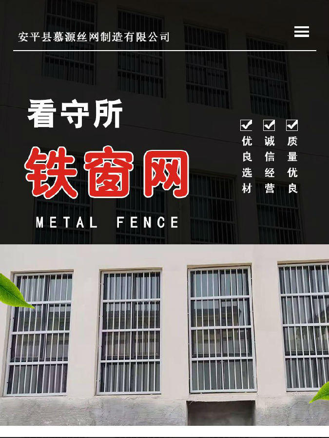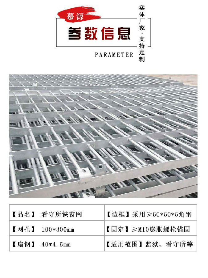 監(jiān)獄防護(hù)窗柵欄,看守所鐵窗護(hù)欄,邊框一般為L(zhǎng)50*50*5mm角鐵,扁鋼40*4.5mm,鋼筋采用φ18-25mm,網(wǎng)孔常規(guī)10*30cm,支持訂做,表面處理為熱鍍鋅或浸塑。